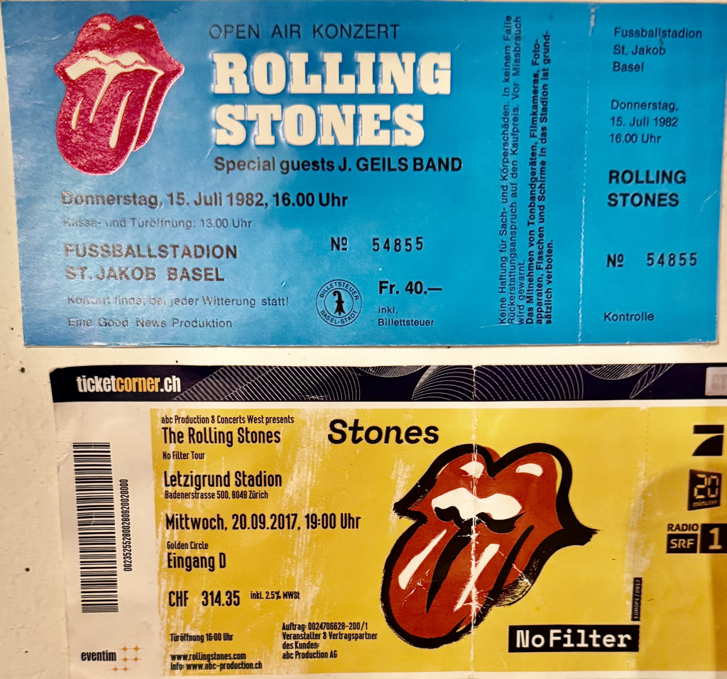 Das Ticket von den Rolling Stones kostete 1982 Fr.40.— und das mit einem super Special Guest, nämlich der J.Geils Band. Im Jahr 2017 war das Ticket dann 314.35 mit Gast Band The Struts. Also wir reden da von einer Kostensteigerung von fast das 8-Fache…!