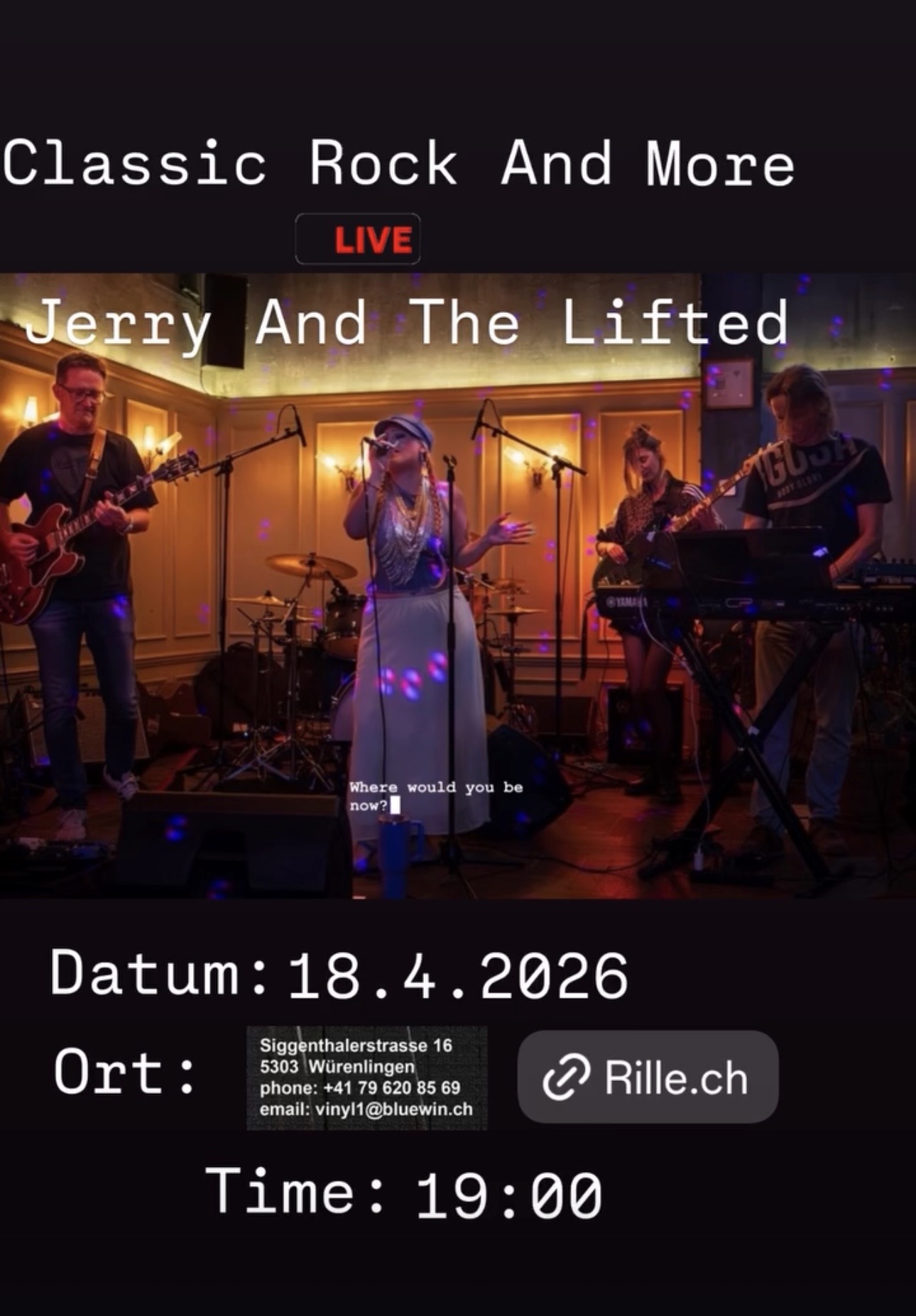 Sichert euch das Konzert von Jerry And The Liftet. 60 Minuten Power sind garantiert. Die Location atmet die Luft der Vinyl Platte. Classic Rock And More lebt auch im Jahr 2026. Mehr Infos zur Location https://www.rille.ch/ Achtung Zeit kann noch angepasst werden.