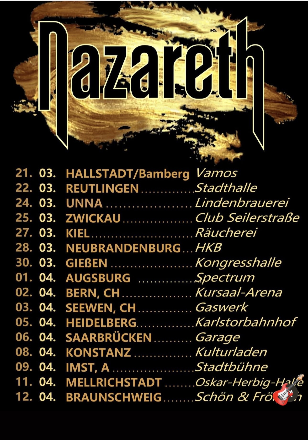 Save The Date! Die schottische Band Nazareth mit einem neuen Sänger auf Europa Tour und mit 2 Daten in der Schweiz. Das Gaswerk in Seewen kann ich bestens empfehlen – tolle Location! Nazareth ist seit 1971 im Geschäft! Sie spielen ihre alten, wie auch ihre neueren Sachen! Classic Rock, genau das trifft auf die Band zu!